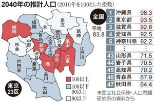 2040(平成52)年には、東京を含む全ての都道府県で人口が減り、4割以上減る自治体が全体の22・9%に及ぶ。国立社会保障・人口問題研究所(社人研)が2010年の国勢調査に基づいて予測した「地域別将来推計人口」は、日本の厳しい未来図を改めて描き出した。